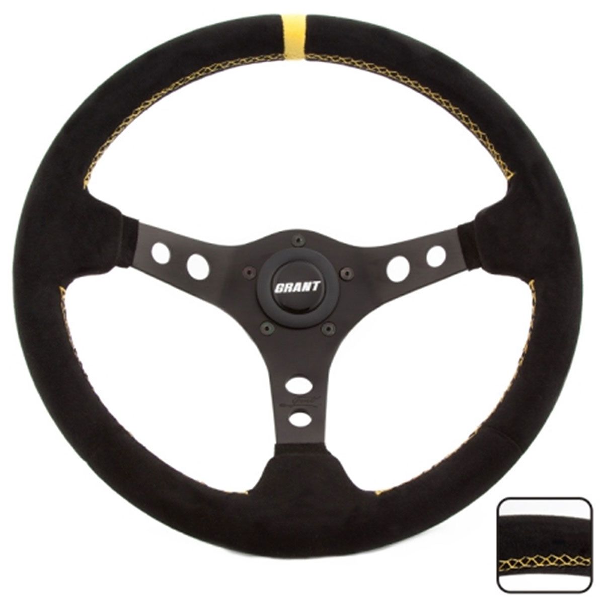 GRANT PERF RACE 13.75″ WHEEL 3SPOKE BLK SUEDE,YELLOW STRIPE