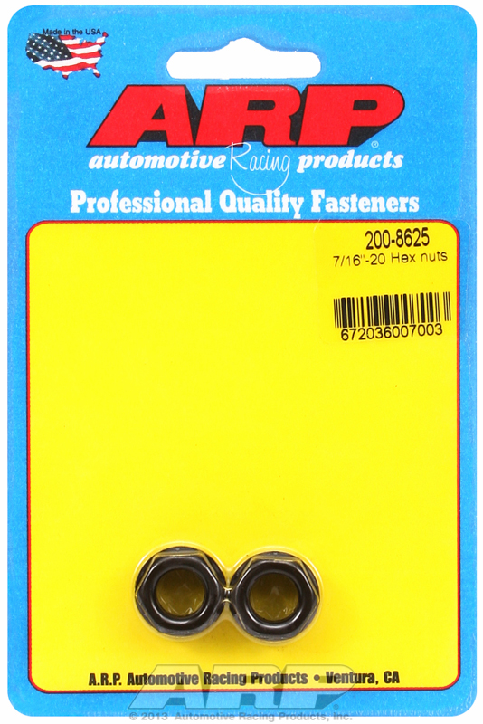 Constructed from the finest aerospace-quality materials, these hex nuts are available in most sizes to meet your needs. All hex nuts meet ARP’s exacting quality control standards and are black oxided. All hex nuts are rated 180,000 psi tensile strength.