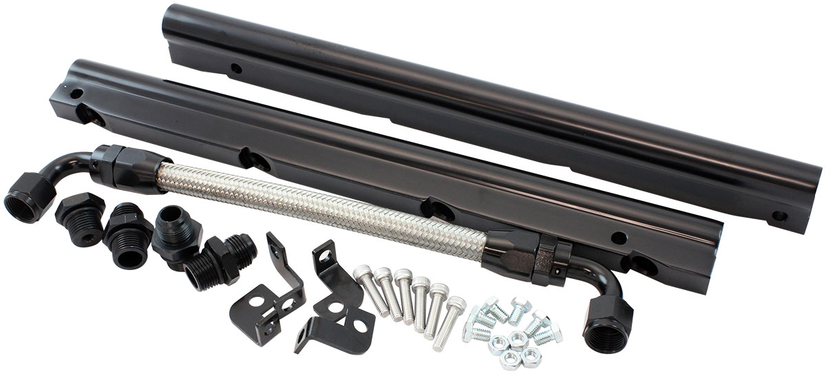 Each fuel rail is precision CNC machined from extruded 6063 aluminium with a large internal diameter bore with -8ORB ports on each end and anodized black.