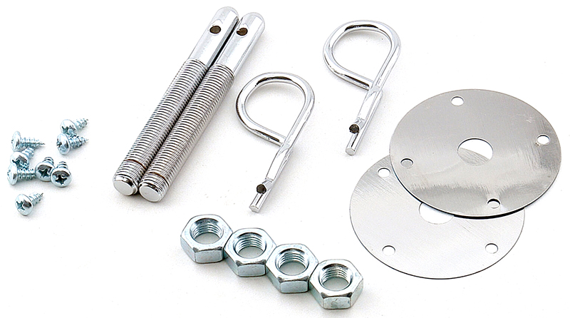 Secure hoods with a competition look. Kit permits quick removal of hood or deck. Two chromed safety pins, scuff plates and necessary hardware are included in each kit. Overall pin length is approximately 4″ with 2-1/2″ of threads. With screw on scuff plates