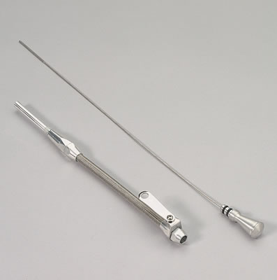 Flexible Engine Dipstick designed with billet aluminum handle to coordinate with Lokar’s Flexible Transmission Dipstick. Slim design allows mounting between header tubes. Designed for use with factory or block hugger headers. Applications available for GM, Ford, and Chrysler. E-Z to Read flexible inner dipstick measuring cable for accurate measure of engine oil.