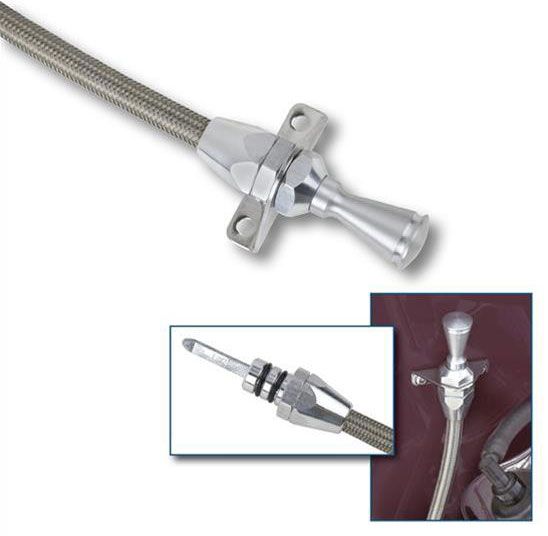 You have flexibility with our Teflon-lined Flexible Braided Stainless Transmission Dipstick. Kit comes complete with braided stainless outer housing and heat resistant E-Z to Read flexible inner dipstick measuring cable. Inner cable is molded with appropriate trans fluid levels. Billet aluminum handle and billet aluminum fittings complement Lokar’s Flexible Engine Dipsticks. Kit includes dipstick funnel adapter to assist in filling. Applications available for GM, Ford, and Chrysler in both firewall mount and Transmount. The firewall mount dipstick measures 24″ in length and is also available in 36″ and 48″ lengths.Transmount mounts to the bell housing and the length varies according to the transmission application.