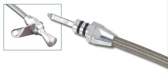 You have flexibility with our Teflon-lined Flexible Braided Stainless Transmission Dipstick. Kit comes complete with braided stainless outer housing and heat resistant E-Z to Read flexible inner dipstick measuring cable. Inner cable is molded with appropriate trans fluid levels. Billet aluminum handle and billet aluminum fittings complement Lokar’s Flexible Engine Dipsticks. Kit includes dipstick funnel adapter to assist in filling. Applications available for GM, Ford, and Chrysler in both firewall mount and Transmount. The firewall mount dipstick measures 24″ in length and is also available in 36″ and 48″ lengths.Transmount mounts to the bell housing and the length varies according to the transmission application.