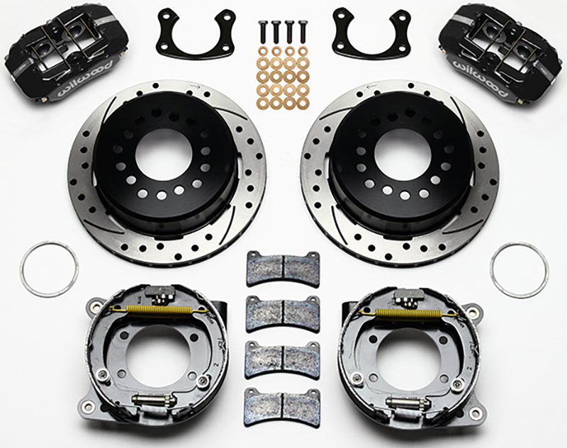 Forged Dynapro Low-Profile Pro-Seriesrear disc brake kits provide acomplete solution for popular muscle car rear axles on applications that require a parking brake assembly and extra clearance for 14.00â€Âto 15.00†rim applications.Forged billet Dynapro Low-Profile four-piston calipers 11.00†one-piecehat and rotor assemblies, and high friction pads provide optimized and balanced brakingfor all types of custom performance street/strip and show machines. The neatly hidden internal shoe system provides a clean installation with superior static holding power for parking. Optional caliper finishes and rotor designs enable the builder to personalize the style and optimize brake performance forevery individual application.