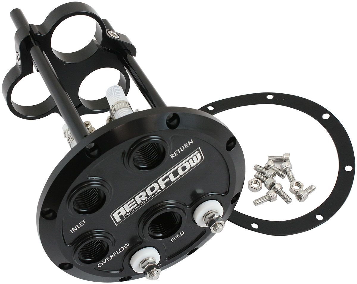 Deliver more fuel to your high-powered car with Aeroflow’s low profile triple pump hanger kit! Our weld in low profile triple pump hanger is CNC machined from billet 6061-T6 aluminium with a black anodized option for maximum durability and corrosion protection against E85/Methanol. The 2-piece head incorporates a weld on ring for fabricating custom tanks. The Buna N O-rings provide a positive seal for the internal fuel log which has a -10ORB feed with a -8ORB return, overflow and inlet. Three -8ORB internal feeds with PTFE intake hose and clamps and single post electrical terminal bulkheads are provided. This billet hanger has the ability to mount one, two or three AF49-1242, AF49-1057 EFI fuel pumps or any 40mm diameter fuel pumps at one time. All 40mm fuel pumps used when staged must include a internal check valve to ensure fuel does not back feed into surge tank.