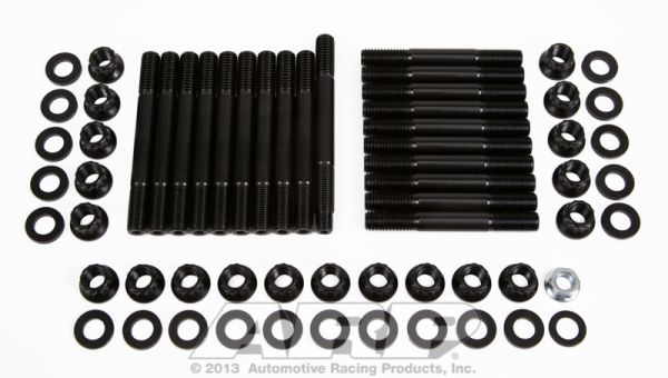 There are many important reasons to use ARP main stud kits, including the elimination of main cap walk and fretting, as well as protecting the threads in your engine block. All kits come complete with hardened parallel-ground washers and high quality nuts. Some applications have provisions for mounting windage trays and have specially designed stand-off studs with serrated lock nuts to position the windage tray and lock it securely in place. The studs are manufactured from 8740 chrome moly steel, heat-treated in-house to 200,000 psi tensile strength, and precision J-form threads rolled after heat-treat to create a fastener that has threads 2000% stronger than others.