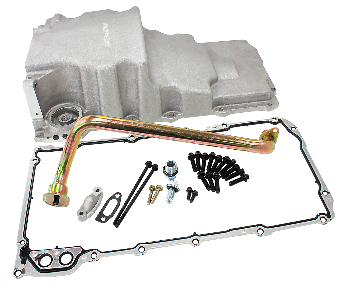 The factory GM LS pans don’t always fit or they hang too low for a lot of conversion applications. The Aeroflow Performance LS conversion oil pan is designedto help! It provides maximum extra clearance to the chassisframes and ground. Designed for LS engine conversion installations where you require more oil pan to chassis frame clearance aroundthe front half of the oil pan.This cast aluminium oil pan ismodelled off the OEM GM LS oilpan so it shares OEM oil filter mounting, OEM oil cooler port provision, OEM engine NVH suppression, OEM flange gasket and sealing and OEM bell-housing attachments. Complete kit includes sump baffle, OE style pick-up tube,sump plug, oil filter stud, oil passage cover.