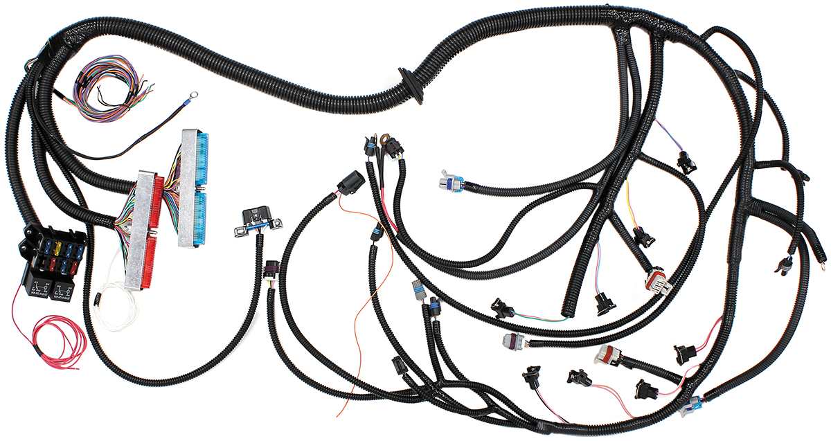Aeroflow Performance wiringharness is designed to be a complete plug and play harnessfor EFI GM LS1/LS6 series engines. It is a complete standalone replacement wiring harness that suits GM LS1 engines (1997 to 2002) with drive by cable throttle body and T56 manual transmissions or non-electronic controlled automatic transmissions. Perfect for retrofitting into older muscle cars and street rods or newer non-emissions-controlled vehicles with a four-wire hook-up (switched power, constant power and ground connections). The harness features a sliding grommet seal for a leak proof installation and 1.2 to 1.5 meters (3.9 to 4.9 feet) of length from the rear of the cylinder head to the PCM mounting position under the vehicle dashboard. The harnessis constructed with GM Delphi connectors and terminals and high temperature wires. It includes all wiring that is required by the Powertrain Control Module (PCM) to run and control the fuel injectionsystem.