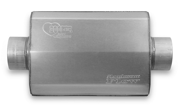 The Hooker Maximum Flow muffler actually flows 99% andproduces more horsepower and torque than a 2-1/2″ open pipe. The Maximum Flow is constructed of an aluminized steel case with stainless steel internal core and uses ahigh temperature packing material to absorb excessive noise while allowing a mellow powerful sound. As with all absorption type silencers, theMaximum Flow will be most effective for sound control with lower compression (8.5 to1 and lower) motors with conservative Camshafts and with applications using catalytic converter(s). The Maximum Flow flows either direction, allowing for easy installation