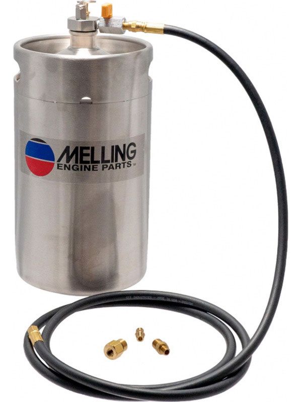 Made In USA. Melling Engine Oil Priming Tank was developed as a way for engine builders to safely pre-prime the engine with oil prior to initial engine startup. The priming tank, when filled with clean oil and air pressure pumps oil into all of the critical areas of the new engine quickly
