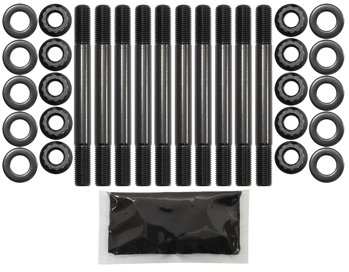 These head studs are manufactured from aircraftquality 8740 high tensile strength chromoly steel and cold-forged to ensure molecular integrity within thestud. Meaning these studs are rated up to 190,000 psi makingthem stronger than Grade 8 andOEM fasteners. All kits come complete with 12-point nuts and hardened washers for an even load distribution and accurate torque readings.