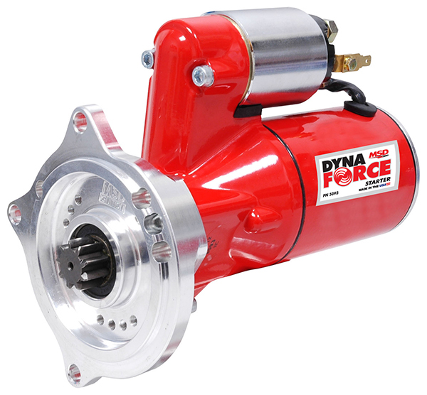 Our new DynaForce Starter is designed to crank over the highest compression engines on a hot day in Death Valley. Not that too many race cars are sitting in Death Valley, but it’s good to know that you have the oomph to make it happen. The DynaForce Starter features all new components beginning with a three horsepower motor. This power is used to crank over the reduced 4.4:1 gear set to deliver great torque to the engine’s ring gear to get the engine turning. The armature is balanced during assembly and is guided by two ball bearings for smooth engagement and thousands of starts. The downsized housing clears most headers and oil pans, but just in case, we made the billet mount so it can be clocked in different positions to help in tight applications. The assembly is powder coated MSD red and will stay looking good, even though it’s underneath your car.