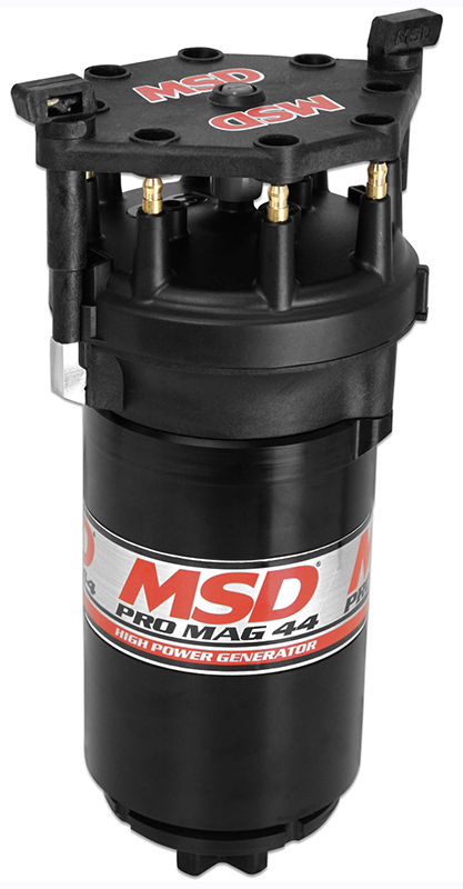 The Pro Mag 44 is the King of all magnetos. With no magnets to recharge, no points to replace and by producing an amazing 44 amps of primary current, it’s no wonder that the Pro Mag 44 is the choice of top fuel dragster and funny car teams! The 44 utilises a proprietary assemblage of rare earth magnets and windings to produce this incredible energy. To accurately trigger all of this energy, a magnetic pickup is mounted in the lower base of the generator and is triggered by one of eight precision paddles on a reluctor mounted to a 0.500″ shaft. This pickup replaces weak and inaccurate points and never requires adjusting. When the pickup is triggered, the signal is sent to the Electronic Points Box where the spark duration is controlled then directed to the 44’s Coil. Over a pound of copper wire goes into the special hand-wound windings deep within the coil where the voltage is immediately stepped up and sent to the mag’s cap whe re it gets tributed to the correct spark plugs creating an explosion of heat and energy in the cylinder. Another advantage to the Pro Mag 44’s design is that you can incorporate optional accessories. A crank trigger can be adapted to trigger the mag for the ultimate in ignition triggering. Also, a Timing Retard Control or even a rev limiter can be used for improved consistency and safety! The MSD Pro Mag 44 is hands-down, the most powerful and accurate magneto available with the durability to match the performance. Two versions of the Pro Mag 44 generator are available, a clockwise rotation and counter-clockwise model, in Band Clamp housings only. A cross drive is used to drive the mags and a five inch diameter cap is supplied along with a rotor and wire retainer.
