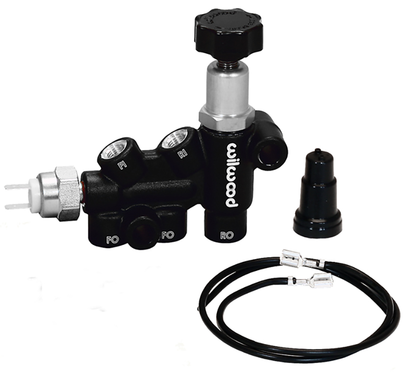 This valve simplifies mounting, plumbing, wiring and brake proportioning adjustments on vehicles with custom brake systems. The combination block maintains full isolation between front and rear fluid circuits and can be used in conjunction with any tandem outlet or dual mount master cylinder assemblies. The rear circuit has a single inlet and single outlet with the adjustable proportioning valve. The front circuit has a single inlet with two outlets. It can be run as a single outlet with one outlet plugged, or used to split the plumbing on its way to the front callipers