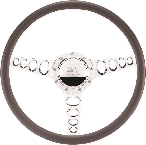 Each Billet Specialties steering wheel is 14 inches in diameter (Some designs also available in 15-1/2″ diamiter) and on the back side of each steering wheel are milled and polished finger notches added for comfort. The front half of each Billet Specialties Half Wrap steering wheel is covered with your choice of leather, simulated carbon fiber or simulated burl wood. Countersunk screws hold the half wrap to the wheel from the backside (a half wrap is required for use with Billet Specialties steering wheels). Because Billet Specialties’ steering wheel components are sold separately, you can mix and match your choice of Steering Wheel, Half Wrap, Horn Button, and Adapter to best fit your needs. Solid billet steering wheels also feature milled and polished finger notches but do not use a half wrap. Order horn button, adapter and leather ring separately.