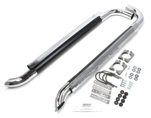 Give your vehicle that custom look with our classic shielded side exhaust system. Large inlet and outlet pipes with low back pressure six-sided louvered core mufflers guarantee performanceand create that distinctive power tone. Complete installation flexibility is built in with the full 360° rotation feature on both inlet and outlet pipes. Includes mounting hardware.