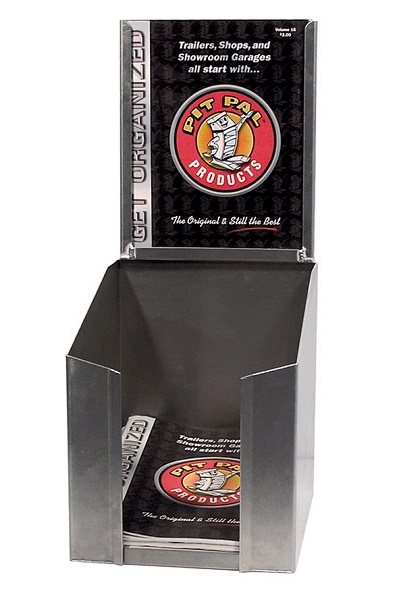 Display your company catalog or literatures at races or trade shows. Our display stand features a header with Lexan front to display your catalogs in. The front is open top to bottom which still allows full views of your catalog cover.