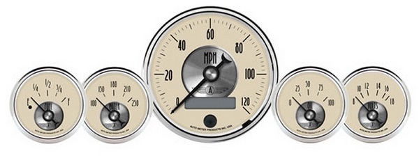 Prestige Antique Ivory Gauges combine nostalgia with the modern accuracy of electrical internals and air core meter design. They have vintage-style domed lenses, hybrid spun aluminium dials, ivory faces, black accents & pointers, and chrome bezels.