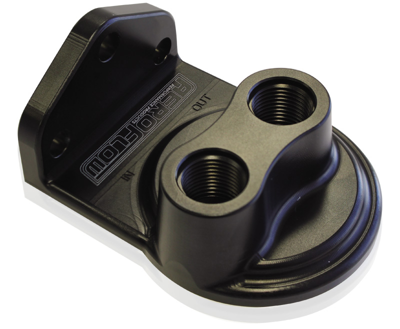 Move your oil filter to newlocation with Aeroflow Performance universal Billet Remote Oil Filter head. This is great for mounting an engine oil filter away from your engine, to make oil filter changes easier or wherespace is limited in the enginebay. Two labelled inlet and outlet -8AN ORB ports are provided for plumbing the engine oil to and from the oilfilter remote mount. The main body is made from billet 6061 aluminium, then anodised blackfor great looks and corrosion resistance. Integrated one piece bracket which can be used to make installation easier in various universal applications.