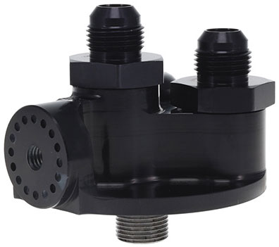 Machined from billet 6061-T6 aluminum and black anodized for durability. Portsare machined for maximum flow and feature a -12 AN Port thread. A 1/87quot; NPT port is machined into the side of the mount for a temp guage. Mounts comes with (2) port fittings and (1) plug.