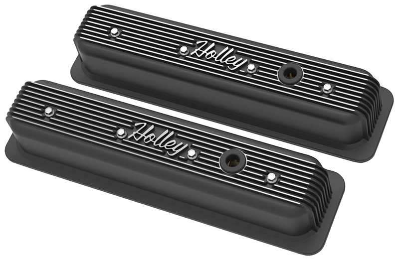 Holley is pleased to expandour Vintage Series line to nowinclude a valve cover option for Small Block Chevys with center bolt heads. The VintageSeries family of die-cast aluminium dress up products features a classically styled finned design and a retro-style Holley script brandmark. These valve covers are standard height (3.5″ overall) with pre-installed internal baffling, and come ina variety of colors and finishes for your unique application. Each set also includes a basic oil fill plug, a PCV grommet, and a polished mounting hardware set. Make your engine a statement piece with Holley’s Vintage Series dress up accessories!
