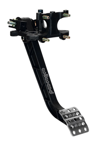 This swinging mount pedal assembly mounts two single outlet brake master cylinders in a reverse position inside the firewall. It features a lightweight aluminum frame, with a high strength reinforced I-Beam style forged6.25:1 ratio pedal arm. The non-skid waffled pedal pad canbe laterally adjusted for driver preference or clearanceas necessary. The balance bar incorporates a positive detentstop every full turn to maintain adjustment position and driver awareness. A pin and clevis pushrod attachment system provides highest possible degree of misalignment angle for bind free operation through the entire range of travel. The balance bar can be locked in place with the included jam nut, or used with an optional remote cable for quick on-track adjustments. This pedal accepts any Wilwood vertical mount flange single outlet master cylinders that are ordered separately by style and bore size