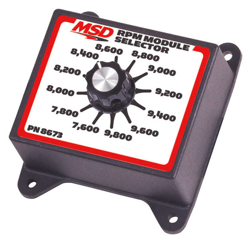 The RPM Module Selector plugs directly into the rpm module socket on all MSD Soft Touch Rev Controls and accessories that use plug-in modules. The user can then select between twelve different rpm limits by simply turning the knob. Six models are available to cover a range from 3,000 rpm to 12,800 rpm in 200 rpm increments.