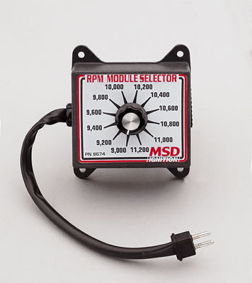 The RPM Module Selector plugs directly into the rpm module socket on all MSD Soft Touch Rev Controls and accessories that use plug-in modules. The user can then select between twelve different rpm limits by simply turning the knob. Six models are available to cover a range from 3,000 rpm to 12,800 rpm in 200 rpm increments.