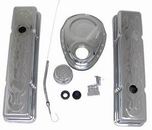 Chrome Small Block Chevy engine dress-up kit with short valve cover with flames.