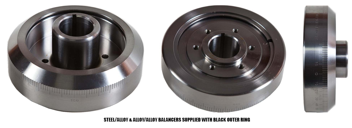 Alloy Inner Hub / Alloy Outer Ring, for Marine or all out Drag Racing or Circuit Racing etc. where nothing is required to be run from the inner hub or outer ring especially dry sump pumps. Extreme weight savings as little as 1kg total balancer weight is possible. These balancers are particularly important to tight cornered tracks where engine revs are low and instant revs are required to accelerate out of tight turns. Neutral Balance Only. RPM range 10,000. Most alloy balancers come with a larger seal boss diameter and seal supplied if applicable.