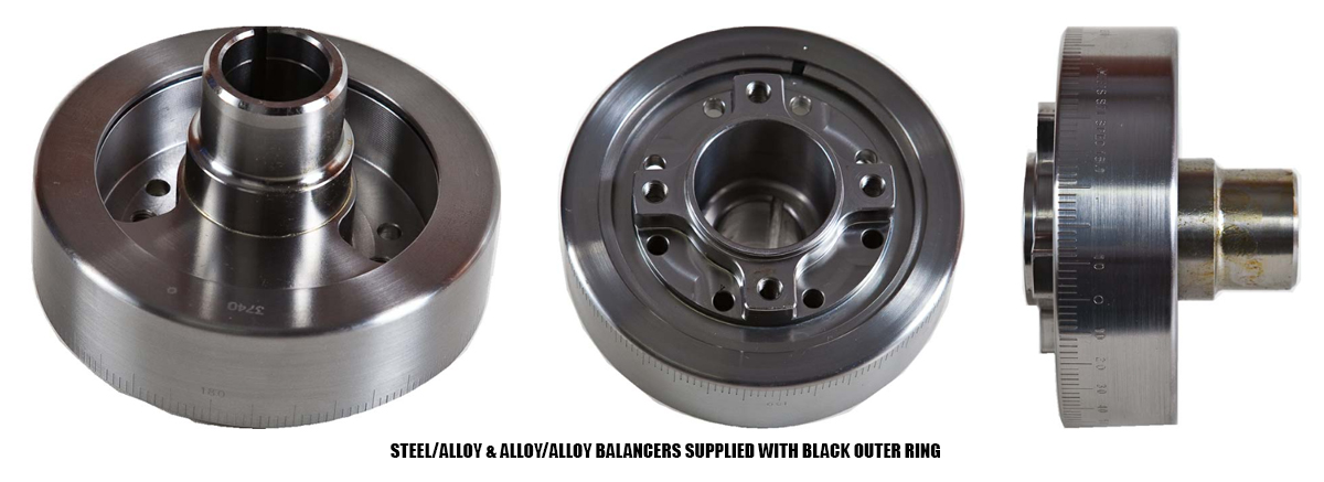 Alloy Inner Hub / Alloy Outer Ring, for Marine or all out Drag Racing or Circuit Racing etc. where nothing is required to be run from the inner hub or outer ring especially dry sump pumps. Extreme weight savings as little as 1kg total balancer weight is possible. These balancers are particularly important to tight cornered tracks where engine revs are low and instant revs are required to accelerate out of tight turns. Neutral Balance Only. RPM range 10,000. Most alloy balancers come with a larger seal boss diameter and seal supplied if applicable.