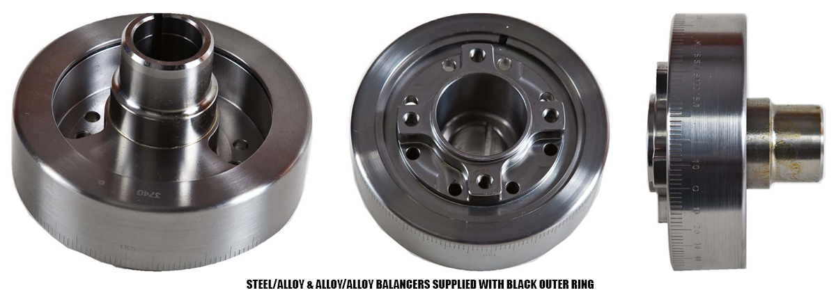 Steel Inner Hub / Steel Outer Ring, for Mild Street, Strip performance engines that offers increased harmonic absorption over stock units. 360 degreed outer rings. Similar weight to factory cast units but with the safety of an encapsulated outer ring. RPM range 8500. Available in External or Neutral balance. Weight from 3 to 5kg’s