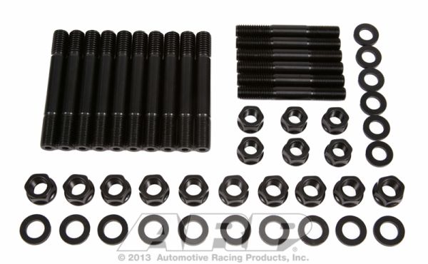 There are many important reasons to use ARP main stud kits, including the elimination of main cap walk and fretting, as well as protecting the threads in your engine block. All kits come complete with hardened parallel-ground washers and high quality nuts. Some applications have provisions for mounting windage trays and have specially designed stand-off studs with serrated lock nuts to position the windage tray and lock it securely in place. The studs are manufactured from 8740 chrome moly steel, heat-treated in-house to 200,000 psi tensile strength, and precision J-form threads rolled after heat-treat to create a fastener that has threads 2000% stronger than others.