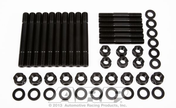 There are many important reasons to use ARP main stud kits, including the elimination of main cap walk and fretting, as well as protecting the threads in your engine block. All kits come complete with hardened parallel-ground washers and high quality nuts. Some applications have provisions for mounting windage trays and have specially designed stand-off studs with serrated lock nuts to position the windage tray and lock it securely in place. The studs are manufactured from 8740 chrome moly steel, heat-treated in-house to 200,000 psi tensile strength, and precision J-form threads rolled after heat-treat to create a fastener that has threads 2000% stronger than others.