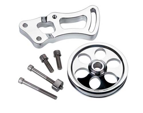Billet Specialties type II power steering bracket with pulley is precision machined from 6061-T6 billet aluminum and mounts low on the passenger side (Aus) of the motor,requires a 3-Groove Grank Pulley.