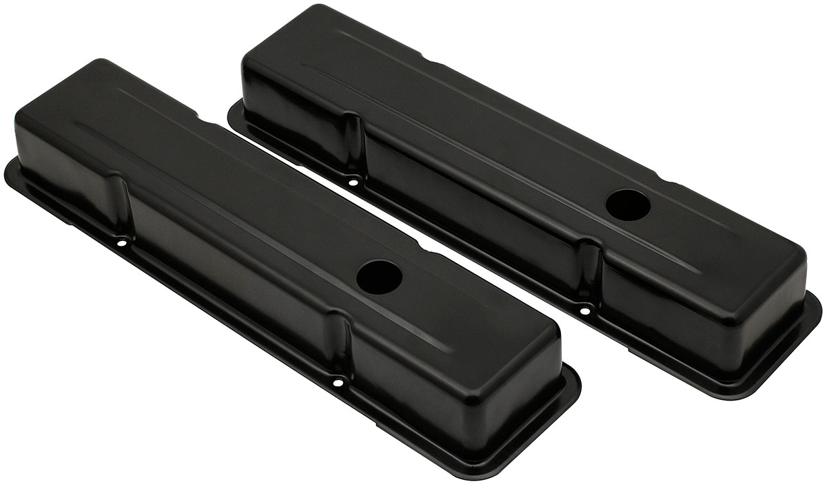 Designed for small-block Chevy, these flat, smooth-top valve covers are stock original equipment height and feature a perimeter-bolt mounting style. Mr. Gasket flat black valve covers fits small block Chevy applicationsand are original equipment height and feature perimeter bolt mounting style. Has one breather/oil fill cap opening per valve cover.
