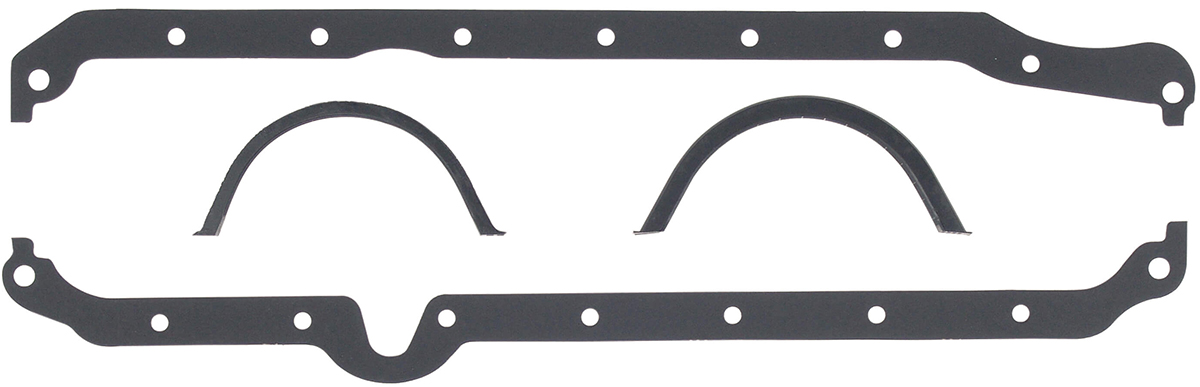 Manufactured from cellulose/nitrile composition gasket material. A black latexrubber coating is applied to outside of gasket to help sealminor oil pan rail irregularities and eliminate the possibility of oil leakage. Provides excellent sealing and durability. Complete with molded rubber front/rear oil pan seals whereapplicable. For original equipment replacement, high performance street, drag race and oval track.