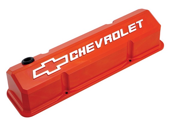 SLANT EDGE VALVE COVERS, SBC CHEVY ORANGE, MILLED EMBLEM