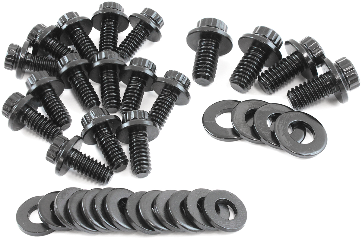 These oil pan bolts are manufactured from aircraft quality 8740 high tensile strength chromolysteel and cold-forged to ensure molecular integrity within the stud. All bolts feature a small 12-point head and hardened washers for an even load distribution and accurate torque readings.