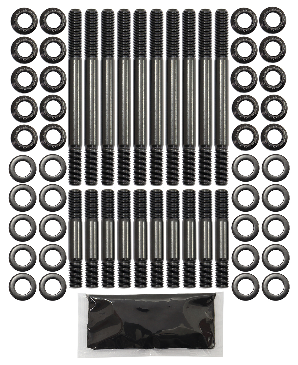 These head studs are manufactured from aircraftquality 8740 high tensile strength chromoly steel and cold-forged to ensure molecular integrity within thestud. Meaning these studs are rated up to 190,000 psi makingthem stronger than Grade 8 andOEM fasteners. All kits come complete with 12-point nuts and hardened washers for an even load distribution and accurate torque readings.