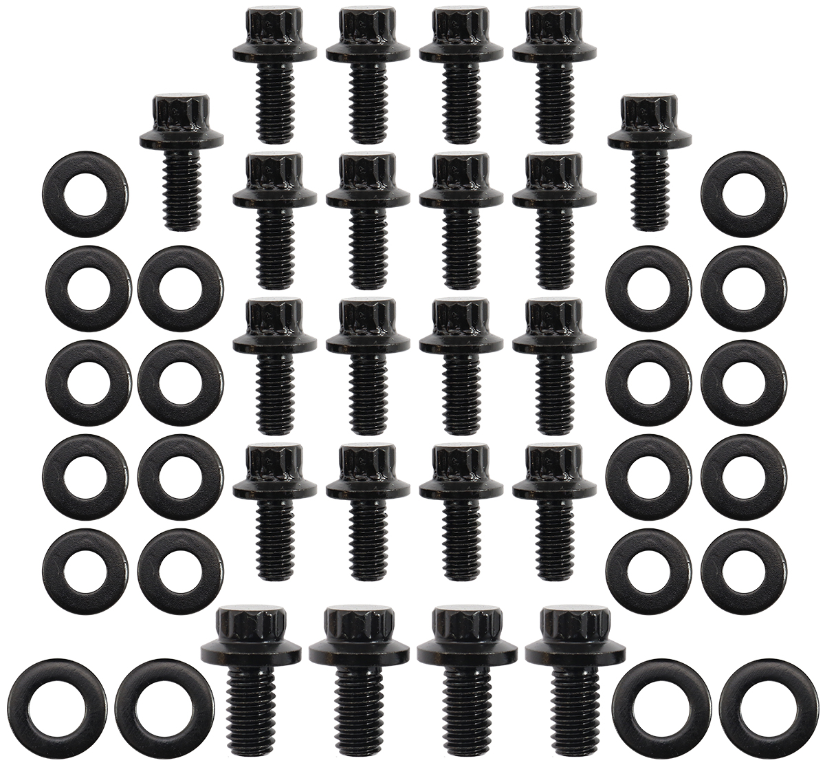 These oil pan bolts are manufactured from aircraft quality 8740 high tensile strength chromolysteel and cold-forged to ensure molecular integrity within the stud. All bolts feature a small 12-point head and hardened parallel washers for an even load distribution and accurate torque readings.