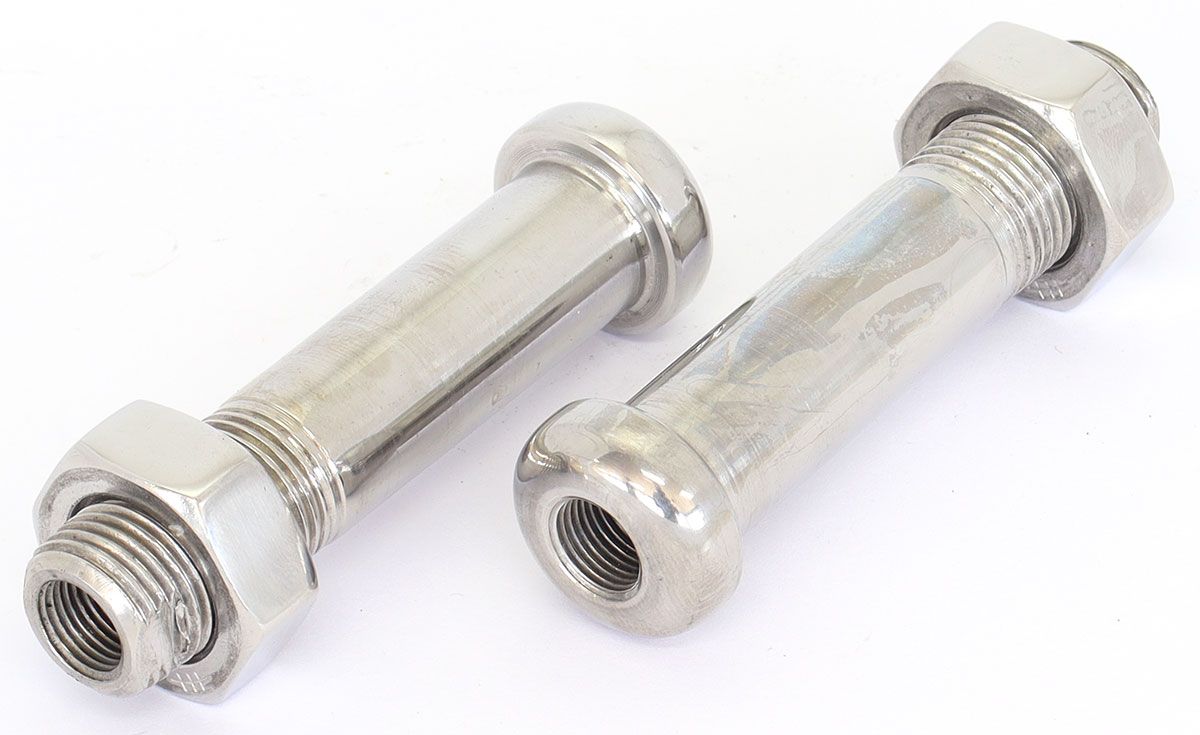 Forget those intrusive brake line tabs that hang under the frame. These thru frame fittings tidy up the front end by running the brake line directly thru the chassis instead of below. Full stainless steel construction with a polished head and nut.