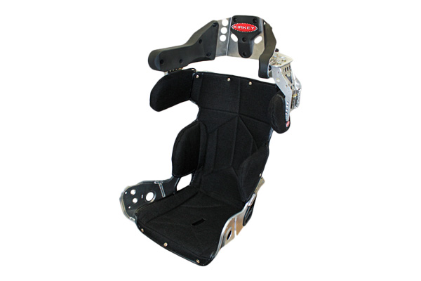 KIRKEY RACING ALUMINUM SPRINT CAR, NORTH EAST MODIFIED SEAT KIT. Designed for Sprint Cars, North East Dirt Modifieds, (including Sportsman and Small Block Modifieds). Five (5) sizes available, (14″, 15″, 16″, 17″ & 18″). Kit comes with black cloth cover. Easily removable cover has additional ½” energy absorbing padding for extra lumbar support. 10 degree layback. Will fit all early style Sprint Chassis. Designed to accommodate all head and neck restraints. Constructed from TIG welded .100″ 5052 grade aluminum. Additional MIG welding adds strength. Contoured elongated bottom reinforced for added thigh and hip support. Energy absorbing padding on seat bottom. Rib and reinforced shoulder supports have extra 1/2″ energy absorbing padding directly on seat. Head restraint is adjustable both vertically and laterally and uses molded high density energy absorbing impact pads that eliminates upholstery. Head restraint can also rotate down for additional ripheral vision. Fabricated aluminum connector brackets for easy head adjustment. Left side of head restraint angled and shortened to allow easy entry, exit. Right side leg extension built in, left side cut back for easy entry, exit. Lap and sub belt openings have molded rubber grommets to eliminate belt wear. Designed to accommodate all seat belt systems. A Frame Mount 1-1/4″ (pair) Pt.# 99215. Included with KIT. Mounts direct to chassis or use mount listed below. Rear Seat mount Pt.# 99208. KIT design reduces shipping cost.