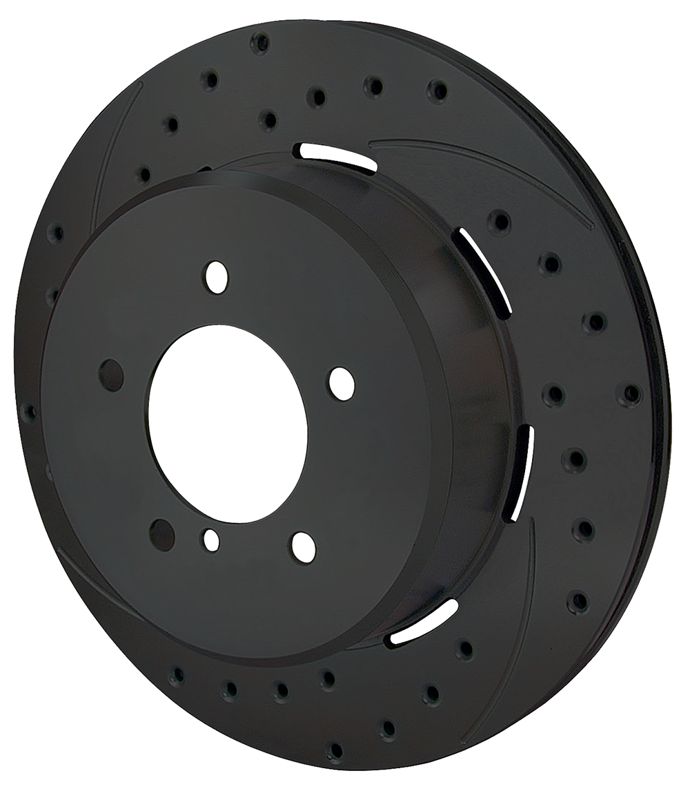 For custom, show and high performance sport driving, SRP rotors offer the high tech look and improved performance of a directional cross-drill and face slot pattern. In addition to the aesthetic appeal, the venting and cleaning action of the hole and slot pattern helps to reduce pad glaze and minimize irregular pad build-up on the rotor faces. The results are a smoother engagement feel at the pedal and consistent response from the pads. Each rotor is precision machined to less than .001 tolerance for overall flatness, parallelism, and radial run-out on long grain carbon iron castings. The rotors are finished with a black electro coat to provide corrosion resistance.