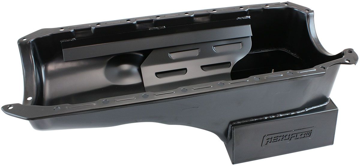Aeroflow’s range of super oil pans available for most popular V8 engines are the perfect choice for street or track driven high performance engines. These pans start out as new stamped steel pans which are customized with specially designed extra oil capacity wings. These wings allow extra oil capacity without affecting ground clearance which helps maintain more constant oil temperatures for reliability and feature windage trays and crank scrapers. Available in black finish. Pans have 6.5 Liter (6.86 US Quarts) capacity.