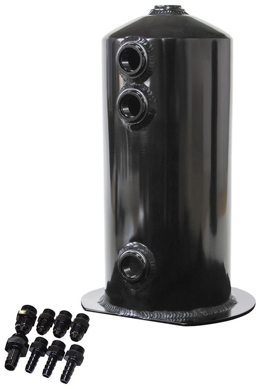 The single outlet 2.5 litre tank itself is made from spun aluminium, featuring four female -8 O-ring ports that allow vast variety of adapter fittings tobe placed into various positions around the tank if required. NOTE: if not using all ports ensure to block themwith fittings (sold separately). Included is both barb and AN adapters to choosefrom to go from customer braided lines or rubber hoses depending on application.