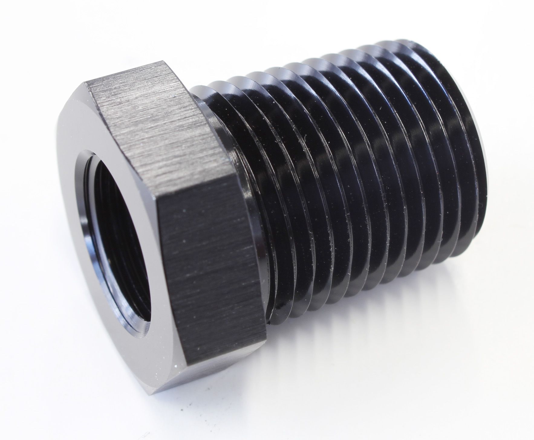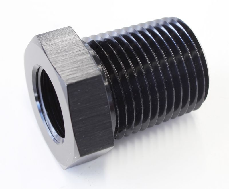 This adapter has an internal thread of 5/8″-18 UNFto suit Autometer mechanical temperature probes. There are three options for the outer thread – 3/8″ NPT, 1/2″ NPT and -10 ORB.