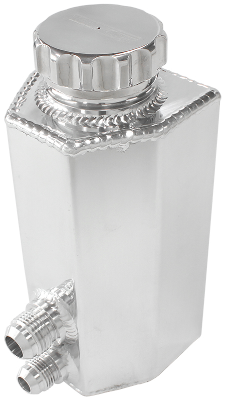 Each tank features a 38mm (1-1/2″) billet cap and can hold 660ml (22.5oz) of fluid. M8 mounting bungs are on each tank for mounting with a -8AN male return to the power steering rack on the bottom and a -10AN male feed fitting for the power steering pump.
