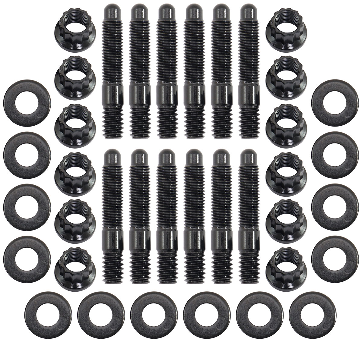 These studs are manufactured from aircraftquality 8740 high tensile strength chromoly steel and cold-forged to ensure molecular integrity within thestud. All bolts feature a small 12-point head and hardened parallel washers for an even load distribution and accurate torque readings.
