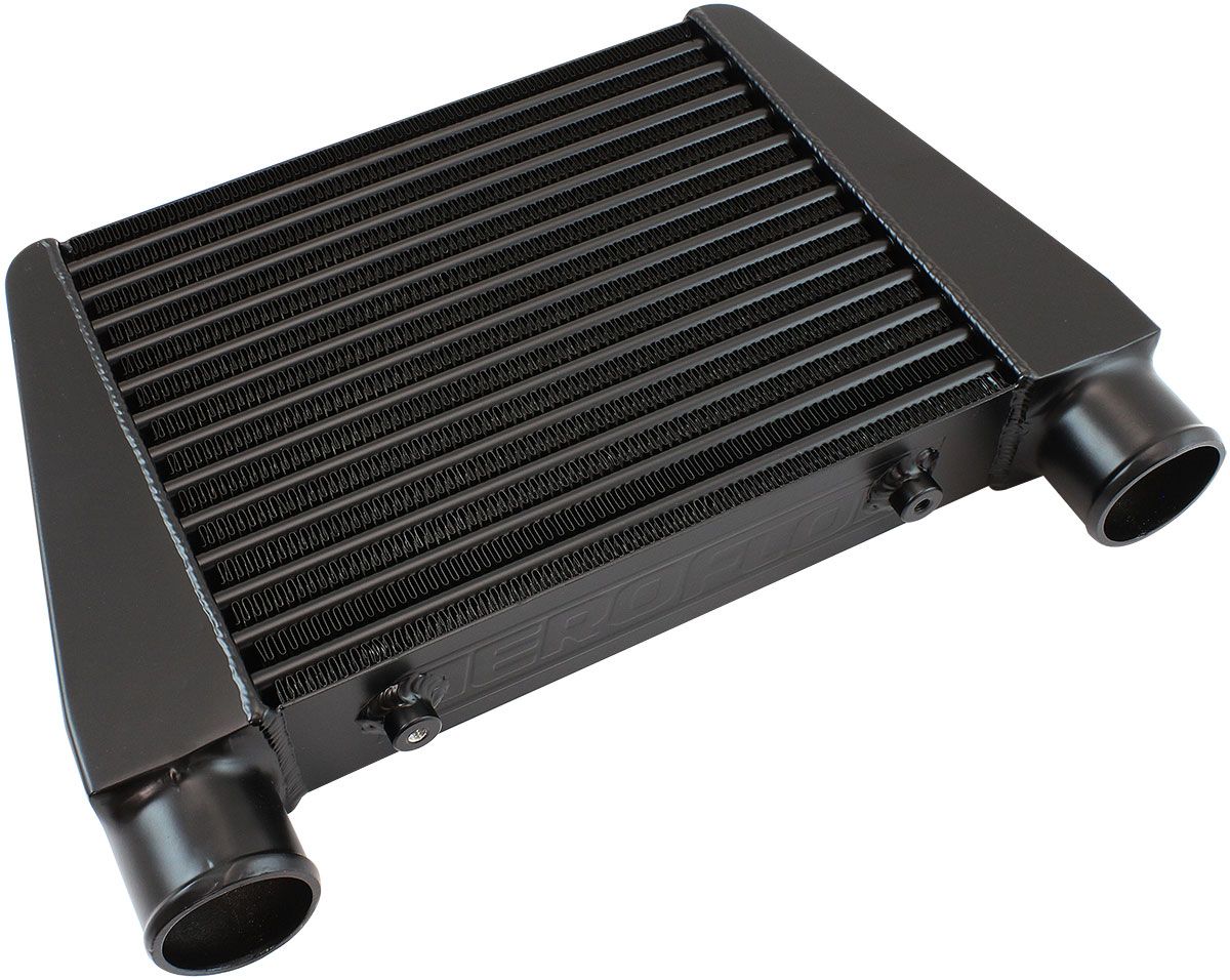 The Aeroflow Performance Street series intercoolers have become quite a popular choice amongst the automotive scene as they are known for their great value and top quality proving to exceed expectations at just a fraction of the price. These V-mount intercoolers are specifically designed for v mount applications or can be used in any universal applications where the intercooler can be mounted horizontal with the inlet and outlets on the top of the intercooler. Made from a durable alloy which is TIG welded. All intercoolers are pressure tested with a recommended maximum of 50psi (3.44 Bar). Aeroflow street series intercoolers are designed with a tube and fin core which offer a low pressure drop which helps withstability on turbo applications. They are available in one universal cores size with 63mm (2-1/2”) inlets and outlets that have a raised lipfor securing silicone hose. Each intercooler features two female M8x1.25mm mounting bosses and are available in silver or black powder coated finishes.